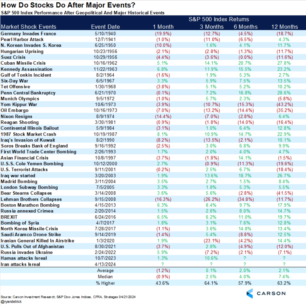 Ryan Detrick, Chief Market Strategist at Carson Group, shared historical stock returns after major geopolitical events…