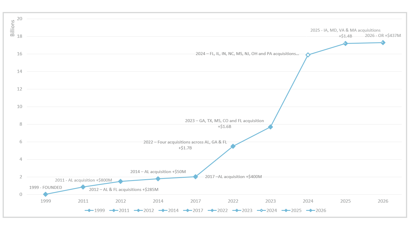 Waverly Advisors (Waverly) was founded in 1999 in Birmingham, AL as a subsidiary of Warren Averett. Since then, we have evolved into an independent holistic wealth management firm with experience in financial planning, investment, estate, and tax planning services, growing both organically and through M&A to 420+ employees and $30.4 Billion in AUM as of 3.16.2026.